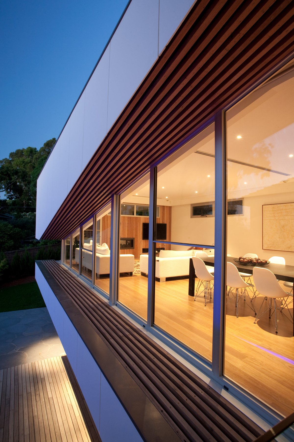Madeira Silvertop Ash tem uma capacidade única para assimilar o rodeia , oferecendo afetar um visual muito diferente. Para o Norte da madeira ainda é evidente , mas apenas no terceiro andares - a partir deste ponto de vista que queríamos o nível superior para aparecer como uma casa na árvore . ExoTec Fachada Sistema do Painel era o outro principal material utilizado porque oferece um contraste refrescante para a madeira.