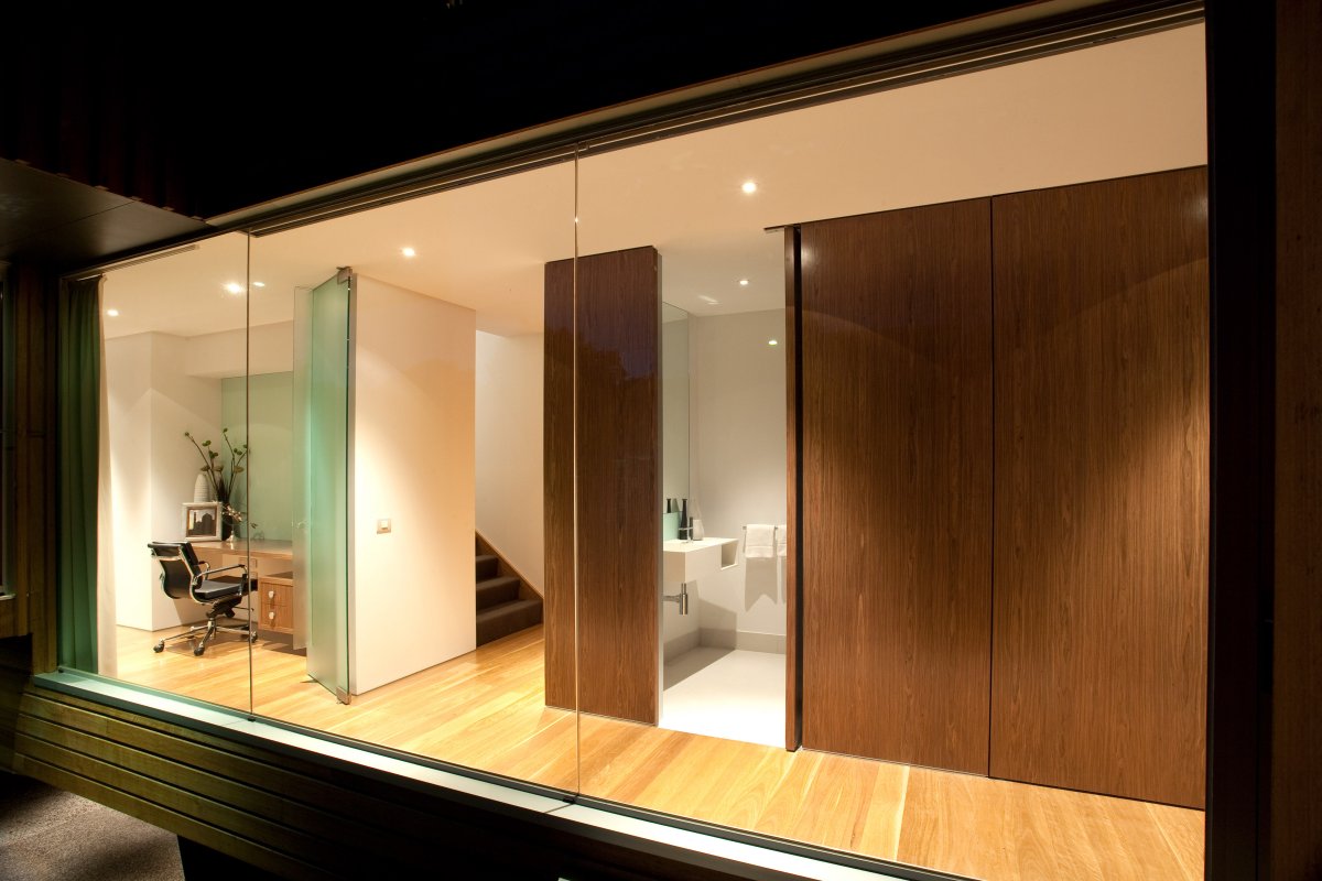 Praticamente , abriga o manto , lavabo, adega e para a cozinha integrada . Está tudo conseguido com portas escondidas que, quando aberto , oferece uma surpresa inesperada . Esta casa está aberta ainda privado e da parede da característica de madeira do interior convida a uma viagem de descoberta . A caixa encastrada na fachada rua aloja internamente a cama dia e uma biblioteca que interage com o espaço de trabalho . O estudo tem um toque de vidro de volta parede escolhido por sua capacidade para refletir a paisagem exterior .