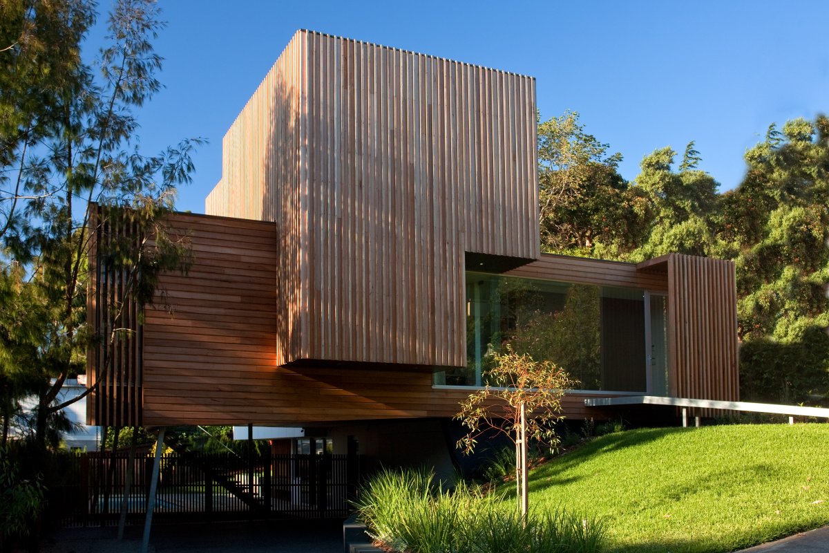 A fachada frontal real foi inspirado no estudo dos anos 60 e início dos anos 70 armários estéreo com a madeira de ripas refletir os elementos de alto-falante de fenda , neste caso eles acomodar a entrada coberto e privado en janela suite. A casa fica levemente equilibrada em postes de aço em ângulo novo que lembram as pernas gabinete estéreo , que dá a casa a aparência de flutuar por todo o terreno .