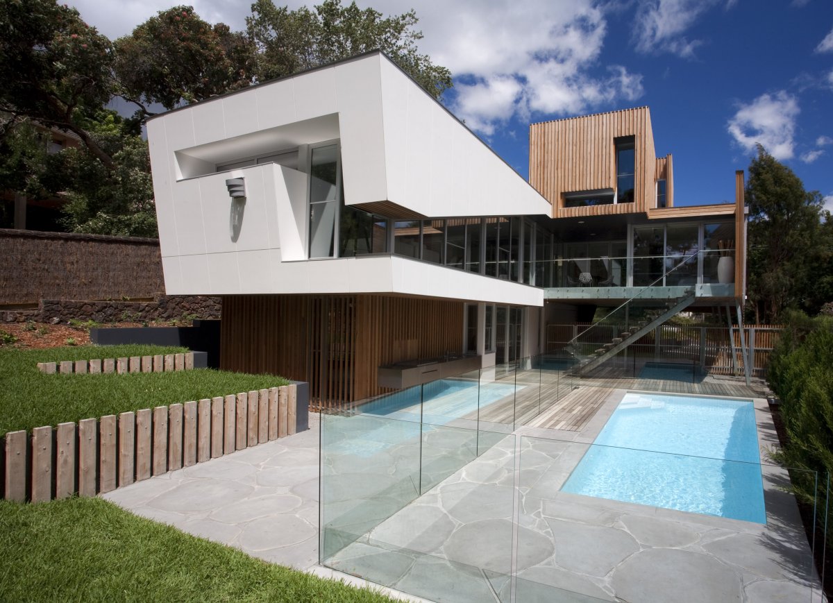 O elemento cortado da janela da sala de estar direciona a linha de visão para a piscina , área para churrasco e espaço de quintal - proteger a privacidade .