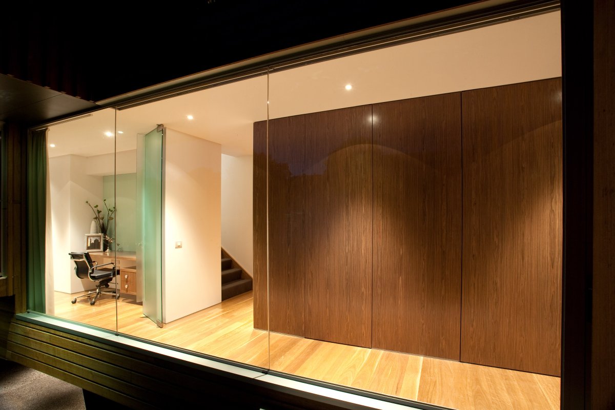 Praticamente , abriga o manto , lavabo, adega e para a cozinha integrada . Está tudo conseguido com portas escondidas que, quando aberto , oferece uma surpresa inesperada . Esta casa está aberta ainda privado e da parede da característica de madeira do interior convida a uma viagem de descoberta . A caixa encastrada na fachada rua aloja internamente a cama dia e uma biblioteca que interage com o espaço de trabalho . O estudo tem um toque de vidro de volta parede escolhido por sua capacidade para refletir a paisagem exterior .